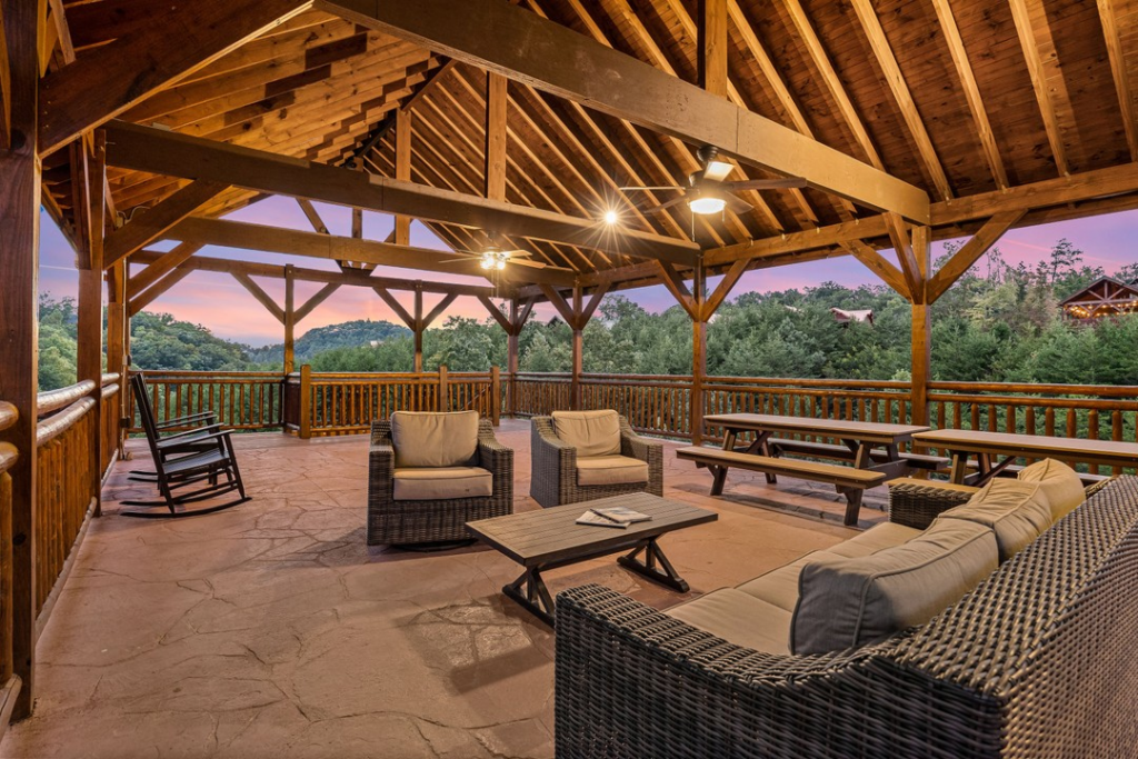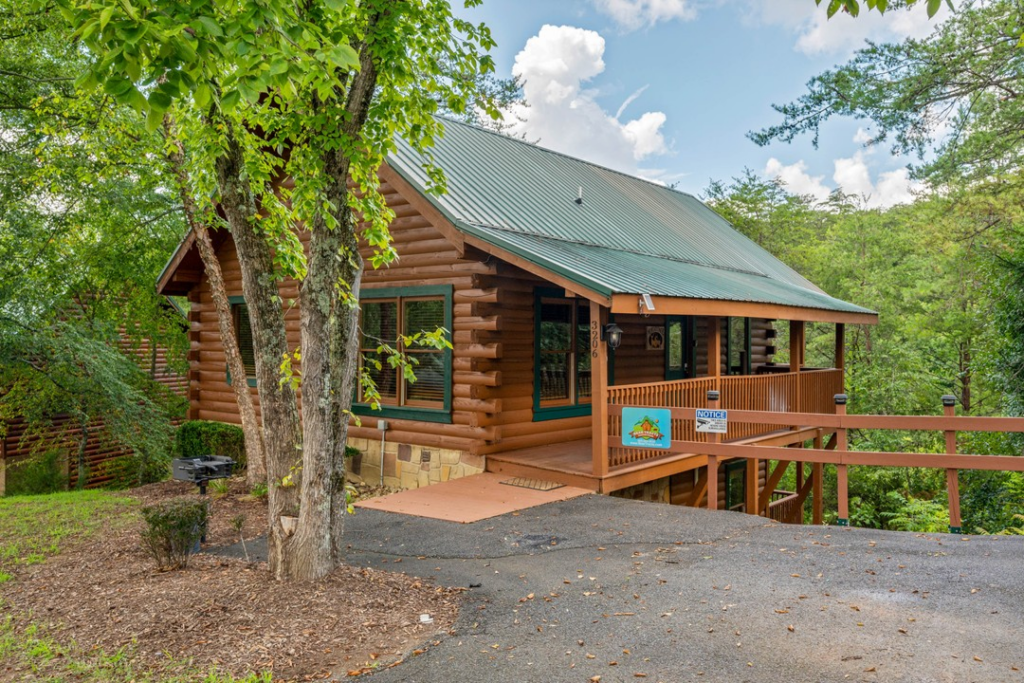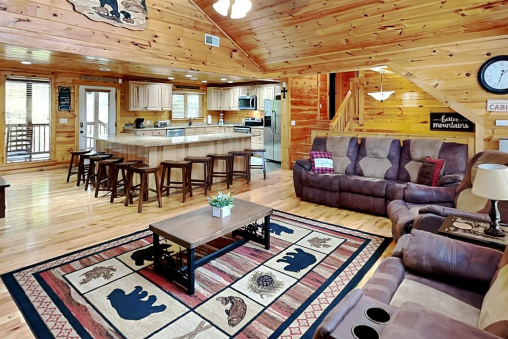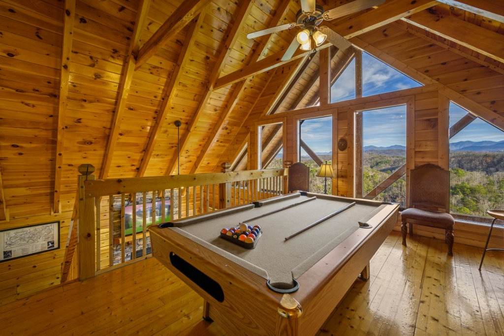 This small cabin includes two bedrooms and two bathrooms but can sleep up to eight individuals. It is tucked away a bit from the more tourist-rich areas, allowing you to sit and relax and enjoy some R&R. This “hidden location” is also the reason for its moniker. However, it being located only two miles from Pigeon Forge means you still have quick access to all the area attractions. Families will love the game room, featuring a pool table, arcade machines, and bunk beds.